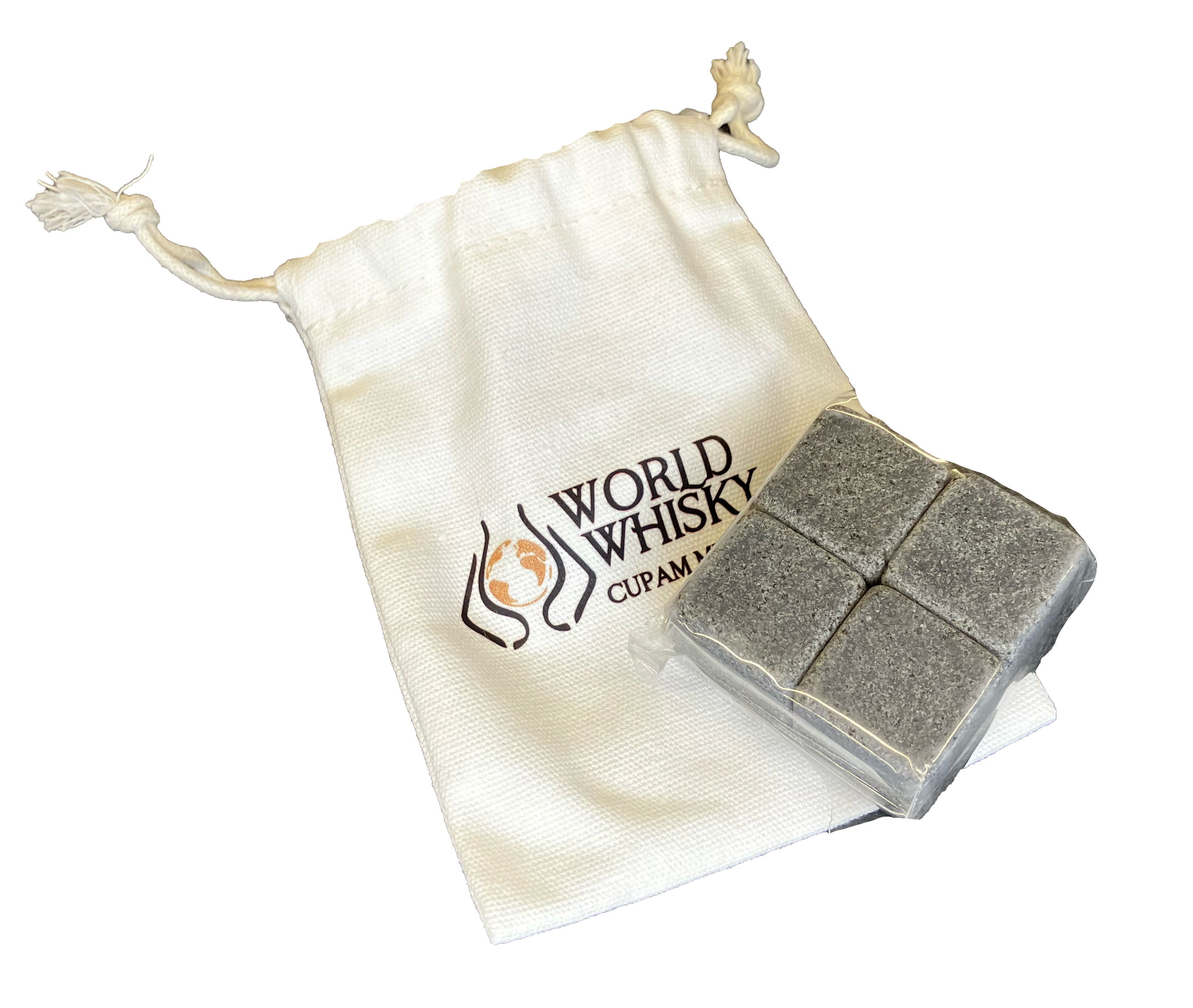 Stein Eiswürfel um Whisky zu kühlen ohne ihn mit wasser zu verdünnen im Säckchen mit Worldwhisky-Branding.